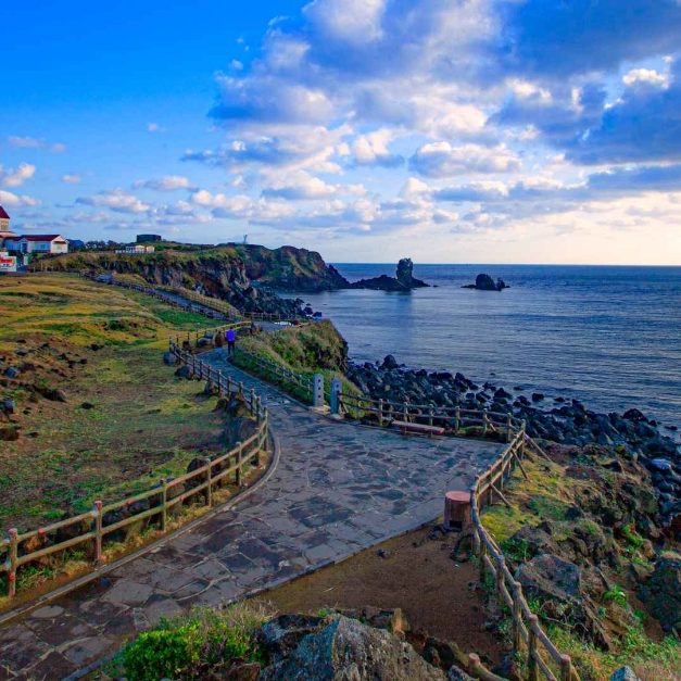 Es uno de los paisajes costeros más espectaculares de la isla de Jeju. Situado en el extremo oriental de la isla, este promontorio ofrece impresionantes vistas del océano, acantilados volcánicos y amplias praderas que cambian de color según la estación.